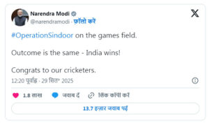 नई दिल्ली (एजेंसी)। पीएम मोदी ने टीम इंडिया को एशिया कप जीतने की बधाई दी है। उन्होंने इस जीत को खेल के मैदान पर ऑपरेशन सिंदूर करार दिया। उन्होंने कहा कि इसका परिणाम भी वही रहा, भारत जीत गया।