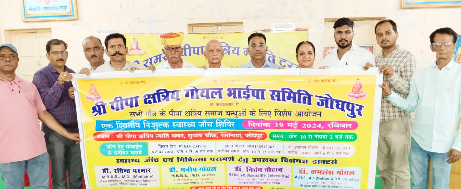 जोधपुर (कासं)। श्री पीपा क्षत्रिय गोयल भाईपा समिति जोधपुर के तत्वावधान में आयोजित एक दिवसीय निशुल्क स्वास्थ्य जांच शिविर के बैनर का विमोचन मंगलवार शाम को किया गया। गोयल भाईपा के अध्यक्ष मनोहर लाल गोयल तथा सचिव इन्द्र मल गोयल ने बताया कि यह शिविर 19मई को रातानाडा स्थिति समाज के भवन में आयोजित किया जाएगा।इस स्वास्थ्य जांच शिविर में डॉक्टर रविंद्र परमार (सीनियर फिजिशियन मथुरादास माथुर चिकित्सालय) ,डॉक्टर मनीष गोयल (फिजिशियन एवं डायबिटीज रोग विशेषज्ञ, महात्मा गांधी चिकित्सालय), डॉक्टर नितेश चौहान (गैस्ट्रोएंटरोलॉजी) मथुरादास माथुर चिकित्सालय तथा डॉक्टर कमलेश गोयल (हृदय रोग विशेषज्ञ, श्री कृष्णा सुपर स्पेशलिटी हॉस्पिटल जोधपुर) अपनी सेवाएं प्रदान करेंगे। शिविर में ब्लड ग्रुप की जांच, इ. सी. जी. एवं शुगर लेवल जांच इत्यादि की सुविधा भी निशुल्क प्रदान की जाएगीl इस कार्यक्रम के बैनर का विमोचन सुभाष चौक रातानाडा स्थित न्याति भवन में किया गया। इस अवसर पर श्री समस्त पीपा क्षत्रिय न्याति ट्रस्ट के अध्यक्ष प्रकाश चावड़ा, कमल गोयल, डा.विजयलक्ष्मी गोयल, शंकरलाल गोयल, दिनेश गोयल, मुरलीधर गोयल, नरपत गोयल, गोपाल सिंह गोयल सहित अनेक समाजबन्धु उपस्थित थे।