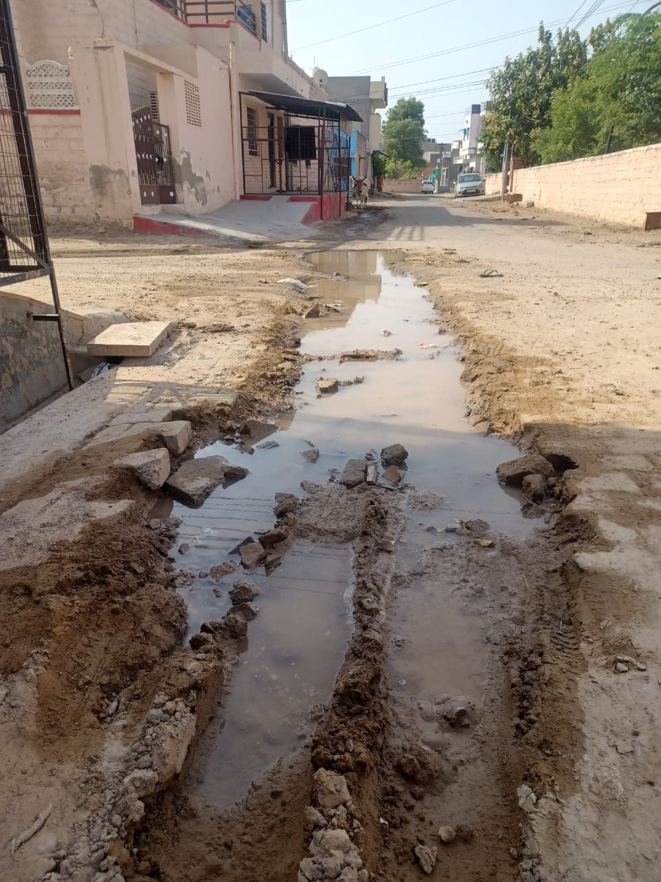 गौरतलब है कि यहां करीब बारह दिन पहले कुछ घरों में कम आपूर्ति की शिकायत पर करीब पचास फीट की दूरी में सडक़ के बीचों-बीच खुदाई कर कनेक्शन शिफ्ट किए गए। उसके बाद इस लाइन को सही ढंग से दुरुस्त ही नहीं किया। तब से अब तक यह तीन बार फूट चुकी है। कुछ दिन पहले ही लाइन फूटने पर सडक़ के नीचे की मिट्टी गीली हो गई। इस दौरान एक स्कूल बस के आगे के पहिए धंस गए। करीब एक घंटे की मशक्कत कर बस को निकाला गया। उसके बाद यहां गड्ढ़ों में पानी भरा रहता है। अनजान बाइक सवार गड्ढ़े के ऊपर से निकल रहे हैं। कई बार वाहन गिरते-गिरते बचता है। इस संबंध में मोहल्लेवासियों ने कई बार अधिकारियों को बताया लेकिन उसकी सुनवाई नहीं हो रही है। दूसरी तरफ लाइन लीकेज होने से एकांतरे होने वाली आपूर्ति भी पर्याप्त नहीं हो रही है।